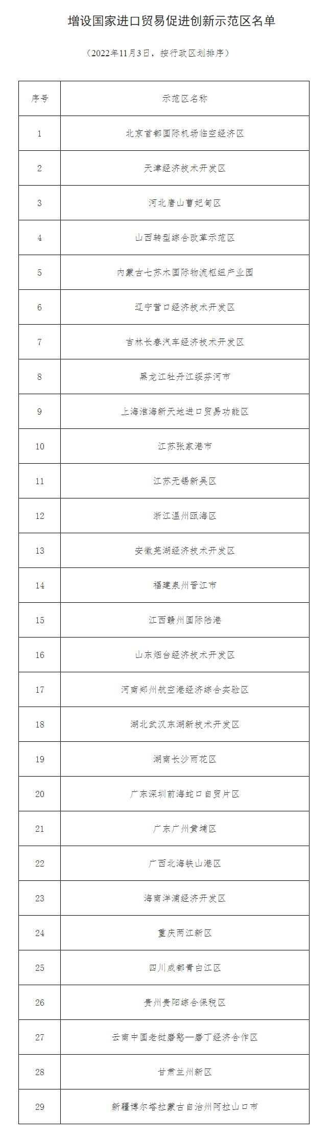 落實習近平主席在第四屆進博會上宣布的“增設進口貿易促進創新示範區”重大開放舉措,商務部、發展改革委、財政部、人民銀行、海關總署、市場監管總局、外匯局、藥監局決定,在全國增設29個國家進口貿易促進創新示範區。
