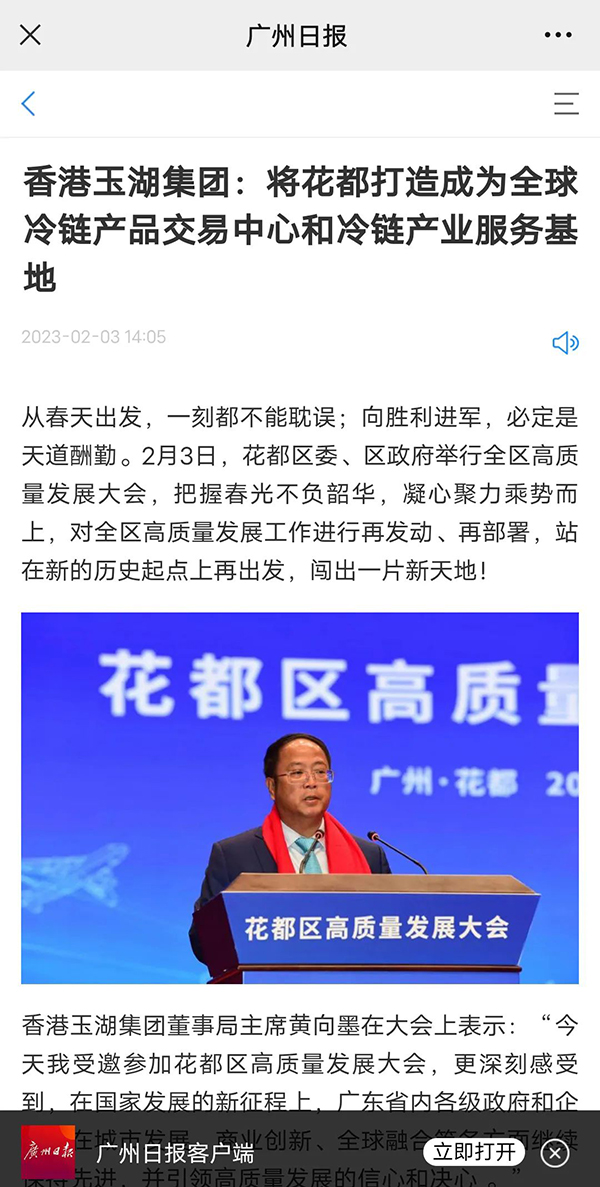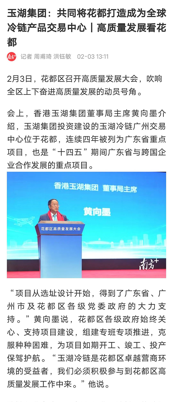 廣州日報也對黃向墨的發言進行了報道。根據報道,冷鏈⾏業在中國是新興⾏業,冷鏈設施建設作為中國保障⻝品安全和⻝品供應鏈的關鍵環節,是當前中國「新基建」的重要基礎領域。為了建設⼀個與國際接軌,集交易、加⼯、倉儲、香蕉视频在线观看黄於⼀體的⼀站式冷鏈綜合園區,⽟湖集團投資近50億元打造⽟湖冷鏈(⼴州)交易中⼼ 。