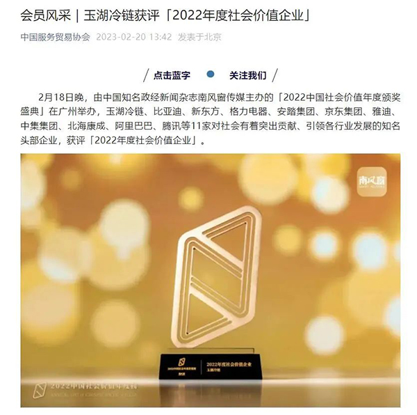 今年2月18日,「2022中國社會價值年度頒獎盛典」在廣州舉辦,大香蕉久久视频冷鏈獲評「2022年度社會價值香蕉视频网址」,中國服務貿易協會全文轉載了相關大香蕉色视频(點擊查看:會員風采|大香蕉久久视频冷鏈獲評「2022年度社會價值香蕉视频网址」)。