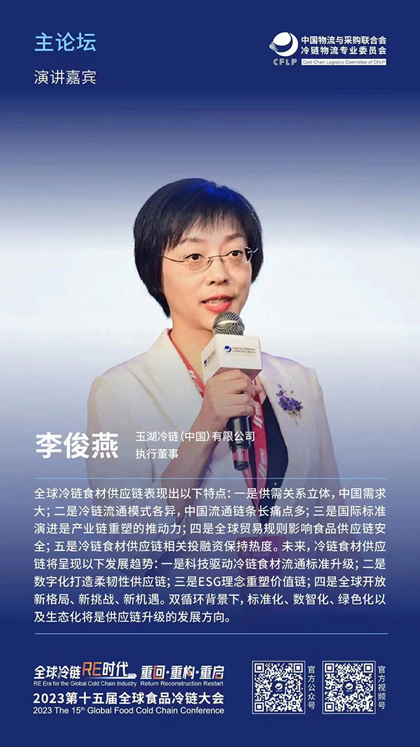 她指出,冷鏈食材供應鏈未來將呈現以下發展趨勢:一是科技驅動冷鏈食材流通標準升級,二是數字化打造柔韌性供應鏈,三是ESG理念重塑價值鏈,四是全球迎來開放新格局、新挑戰、新機遇。