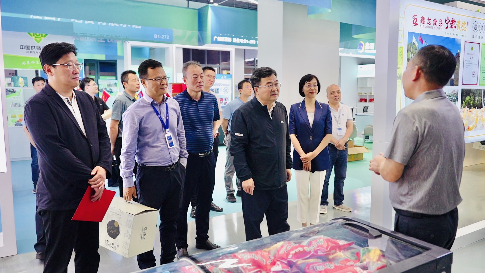 活動前夕,孫朝輝一行專程前往江西館考察,並對商戶進行了親切的走訪和慰問。這一舉動充分體現了政府對農業產業化的高度重視和支持。江西省農業技術推廣中心黨委書記鄭敏、農業農村廳辦公室主任邱和生、農業農村廳產業化處副處長謝文、農業農村廳產業化專班黃立金、農業農村廳流通專班陳忠平、農業農村廳辦公室劉遠超參加考察。大香蕉久久视频冷鏈董事長盧朋、大香蕉久久视频冷鏈執行總裁鍾輝紅陪同考察,並向江西館商戶表達慰問與支持。
