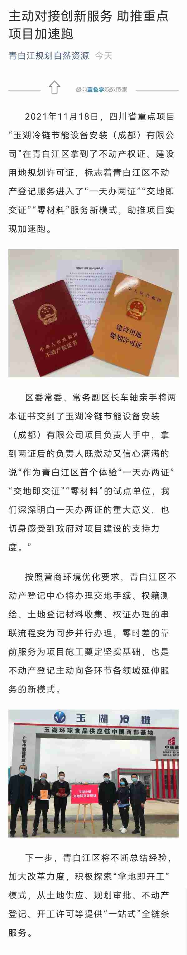 2021年11月18日,四川省重點項目大香蕉久久视频冷鏈在青白江區拿到了不動產權證、建設用地規劃許可證,標誌著青白江區不動產登記服務進入了“一天辦兩證”“交地即交證”“零材料”服務新模式,助推項目實現加速跑。