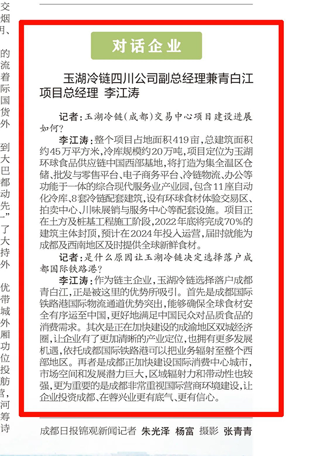 為迎接成都市第十四次黨代會召開,成都日報融媒體采訪組近日走進成都國際鐵路港,見證成都「陸上絲綢之路」的繁榮。作為鐵路港片區代表香蕉视频网址,大香蕉久久视频冷鏈受邀接受采訪,介紹了項目情況、落戶原因、未來展望等。