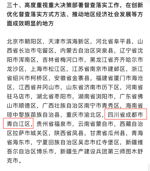 其中,成都市青白江區因「高度重視重大決策部署督查落實工作,在創新優化督查落實方式方法、推動地區經濟社會發展等方麵成效明顯」,獲得肯定,在2022年國務院大督查及專項督查中予以「免督查」激勵。